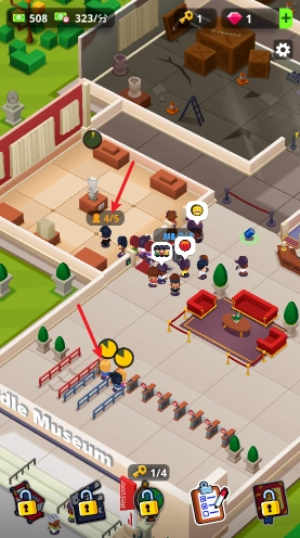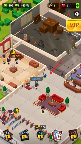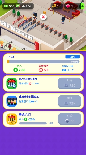 1、进入游戏后,能看到最基础的经营流程:客人在门口购票后进入场馆参观,以此获取收益;参观时需由导游带领,且导游每次带领的人数有上限。
