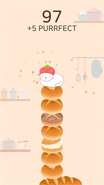 玩家进入游戏后,通过点击屏幕来操控这只可爱的猫咪,让它在不断堆叠起来的面包塔上进行跳跃。