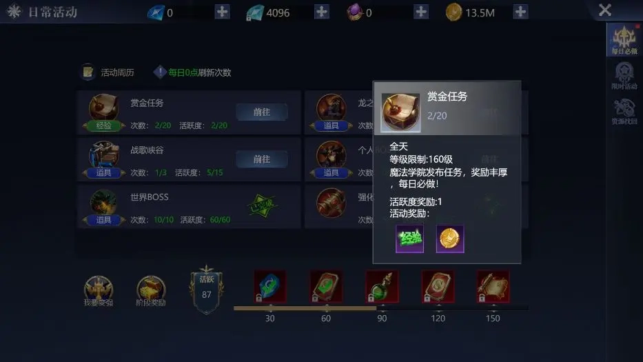5、赏金任务:完成伊瑟拉发布的赏金任务,获取经验和金币,提升等级和战力。