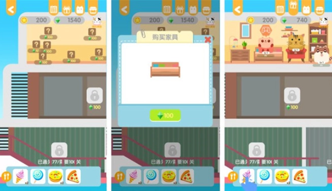 3.家园装饰系统,通关奖励装饰品,解锁家具、房间,与动物互动完成任务