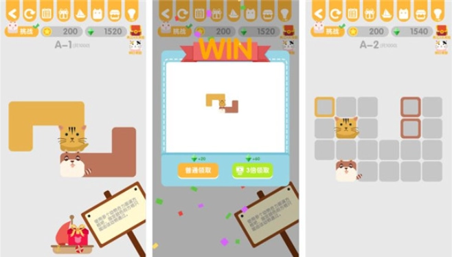 4.解锁了第一个房间的家具后,小动物们也住了进来。之后可以拖动下方的食物到小动物身上后需要停留一会给它们喂食,吃完后会给金币,增加亲密度。
