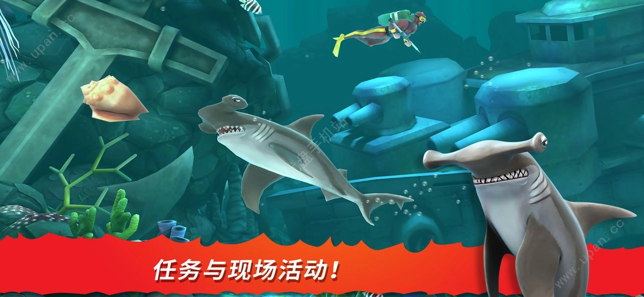 4、完成50个任务,寻找宝物取得金币与宝石,用来升级你的鲨鱼或者购买特殊救生道具。