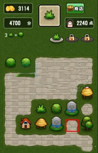 游戏规则是三个或以上相同元素连在一起可升级为更高级建筑,例如从草丛合成大树,