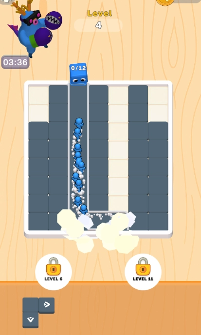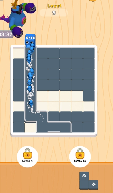1.铺路消除玩法:通过拖动方块为零食小人铺设道路,以此考验玩家的布局规划能力。