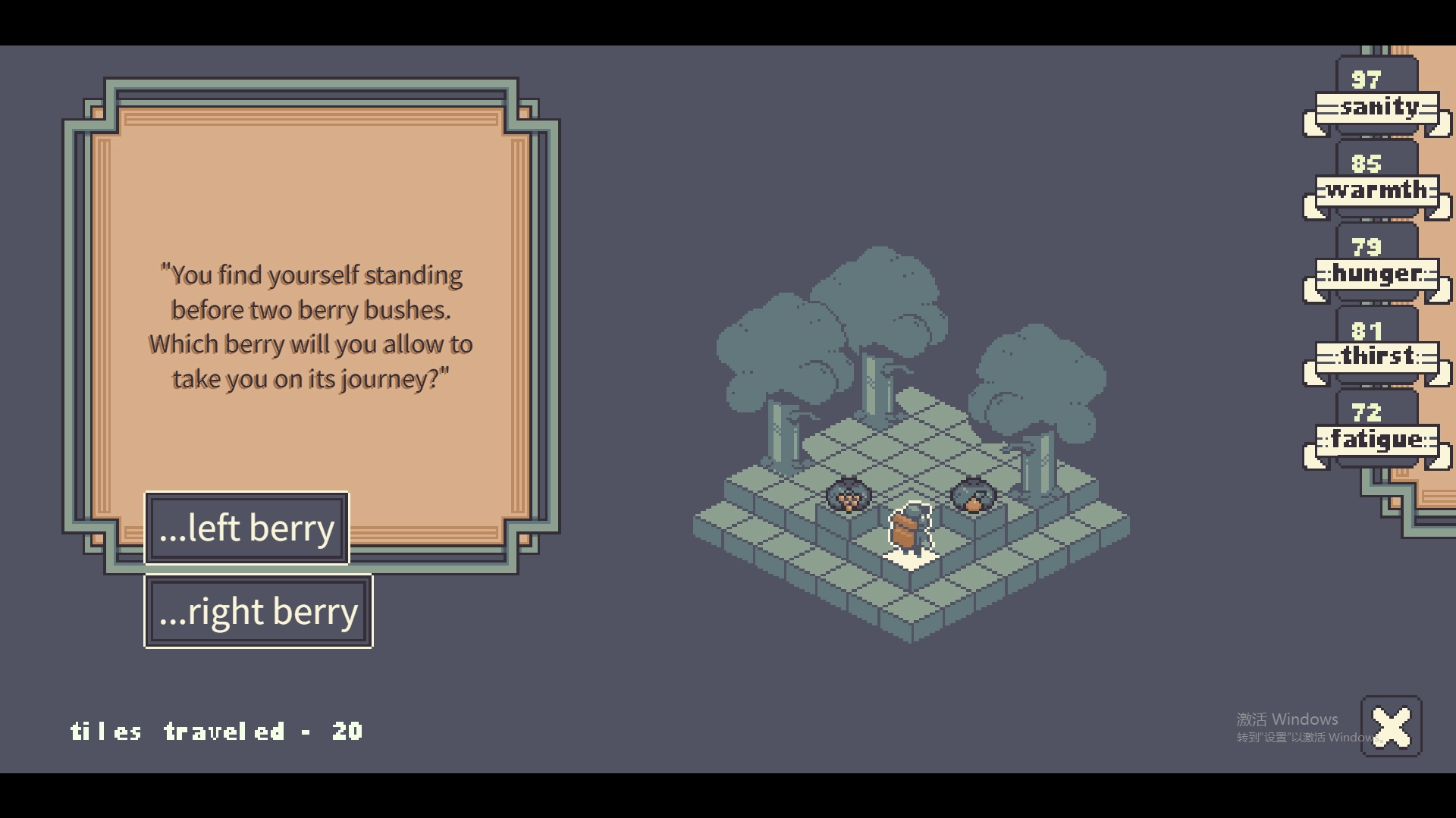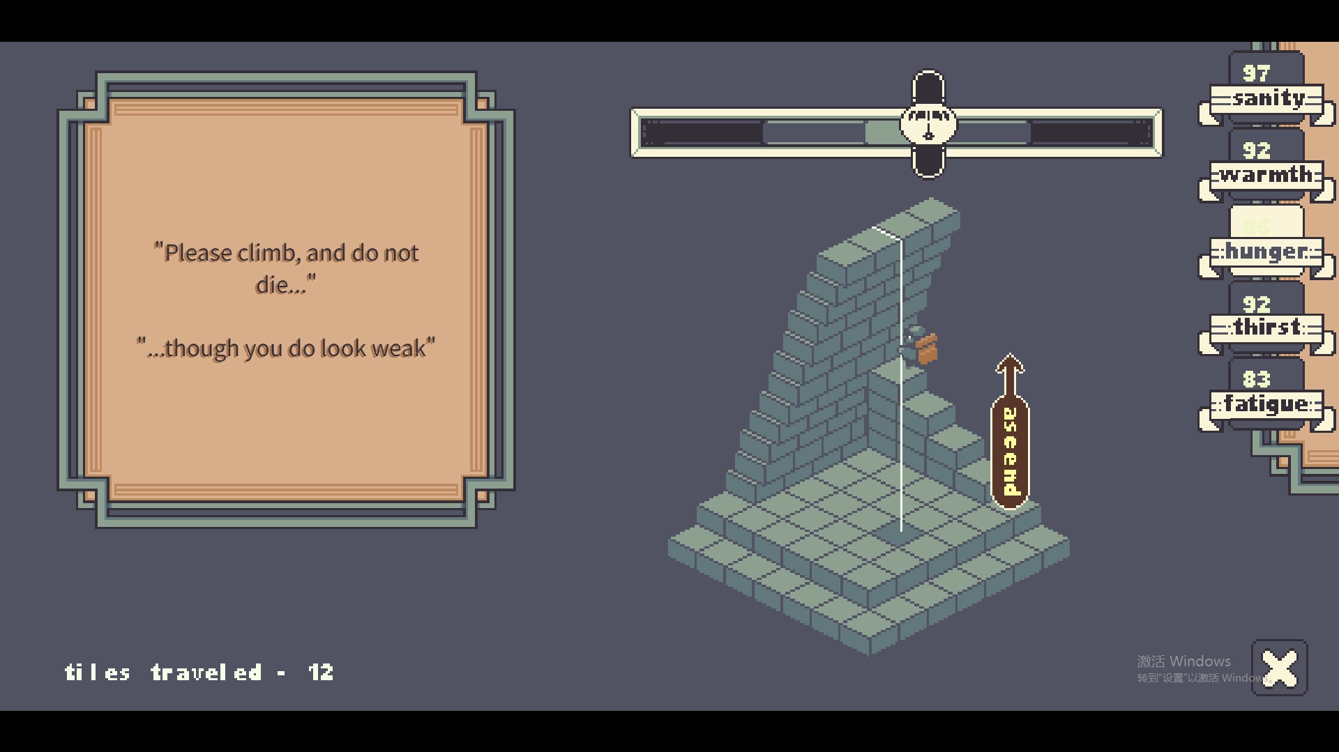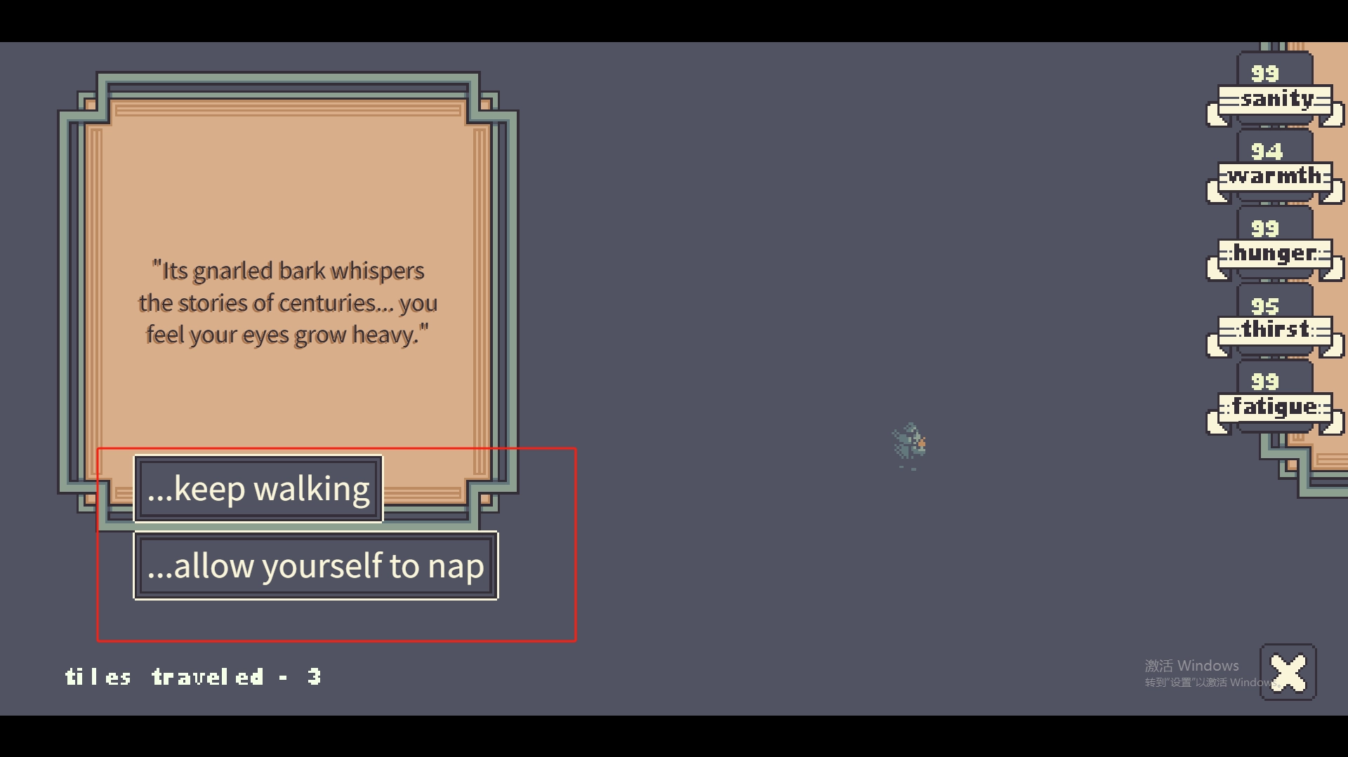 2.游戏的右侧分别代表你的理性值、温暖值、饥饿值、口渴值以及疲劳值