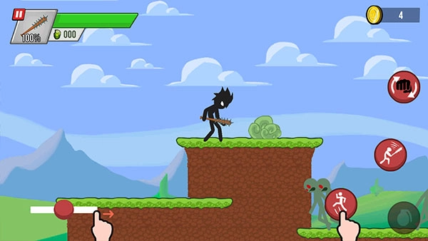 1、借助左侧控制区域来指挥角色完成左右方向的移动,利用右侧控制区域来操控角色执行跳跃与攻击动作