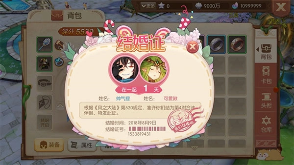 --结婚证会有双方姓名,合照,结婚时间,爱情宣言,风之大陆第几对结为伴侣的人,携手岁月(结婚多久X天X小时)