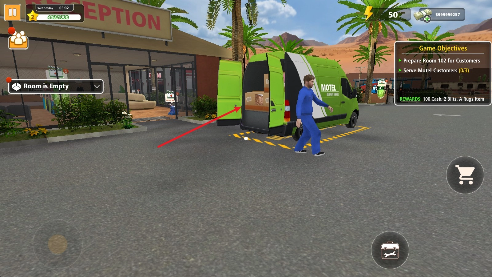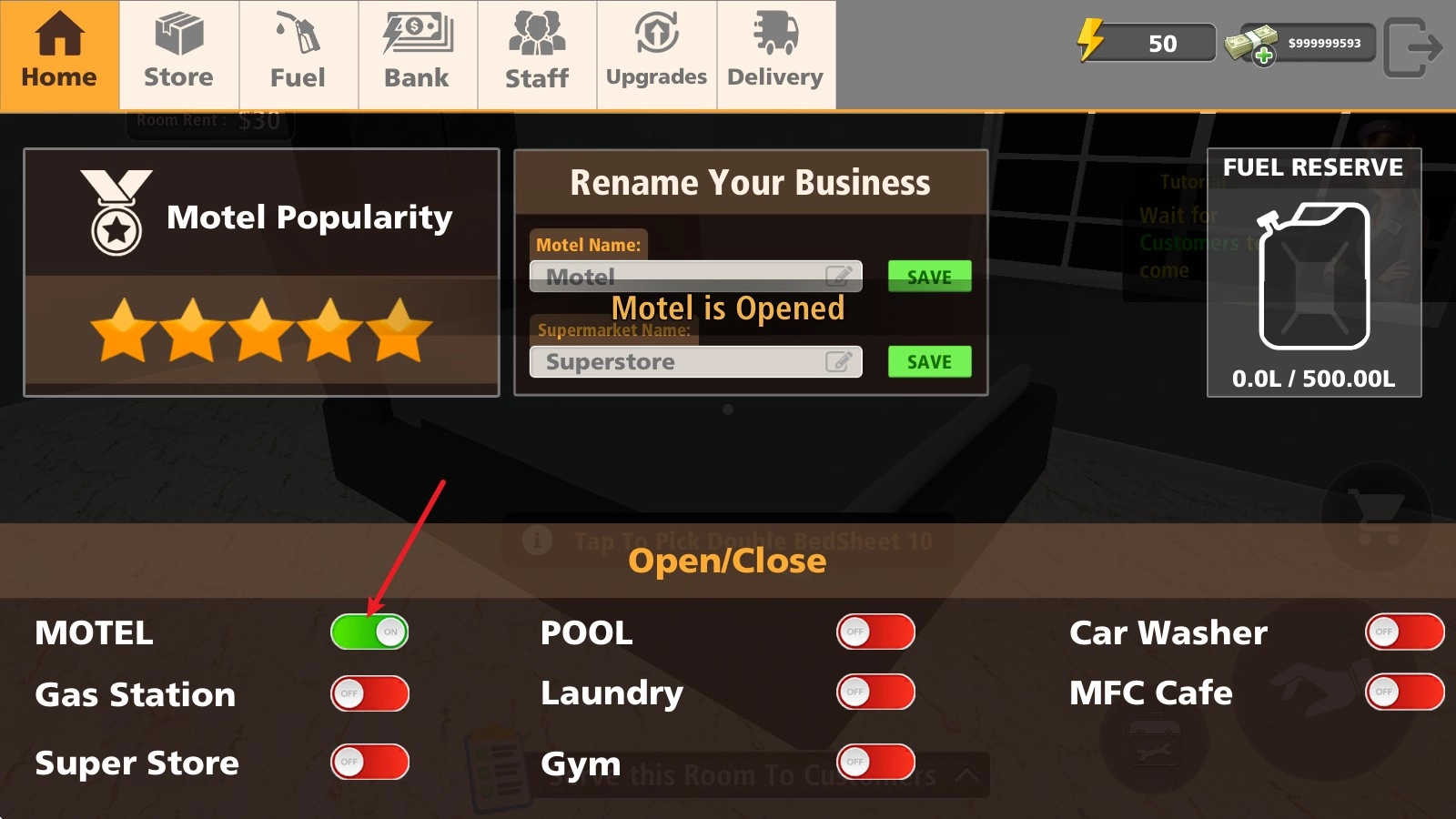 5、房间布置好之后就可以开始经营了,点击右侧的商店,点击这里的MOTEL即可开始经营。