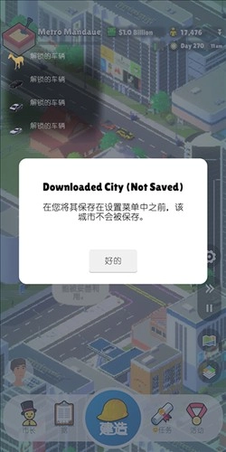 5、城市完成后即可自动进入城市之中,此时会弹出城市数据还未保存的提示,我们手动保存至存档之中即可