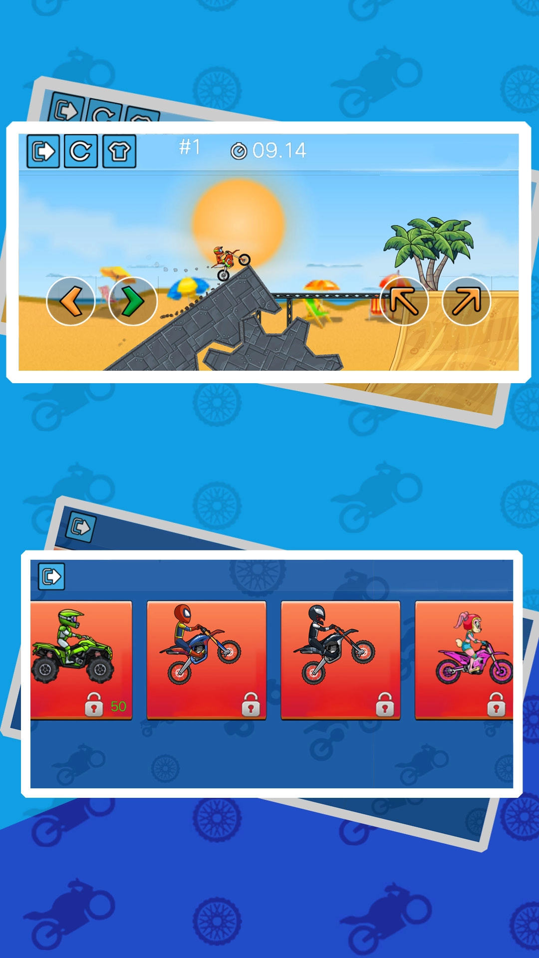 2、在丰富多彩的卡通世界中感受摩托车驾驶的激情,解锁更多的摩托车参与游戏。