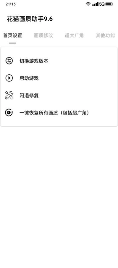1、软件首页设有玩家可使用的功能,包括切换游戏版本、启动游戏、闪退修复以及一键恢复所有画质等。