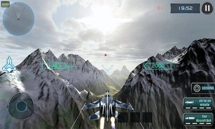 3.战斗中通过摇杆控制战斗机飞行,左上角雷达可显示敌机所在地,在雷达指引下迅速锁定敌机,用导弹和子弹射击敌机。