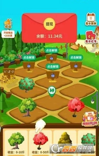开心果园红包版是一款趣味十足的果园赚钱小游戏,它为用户打造了一个线上虚拟果园,大家可以在线种植果树,为果树浇水、施肥。等果树结果后,既可以选择让果实邮寄到家,也能将其兑换成收益。感兴趣的朋友,欢迎通过西西平台体验使用!