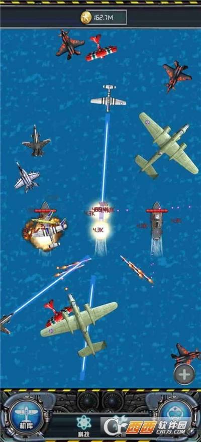2、游戏中解锁升级你的战机,战机会发射枪炮、激光、导弹等自动击打目标。