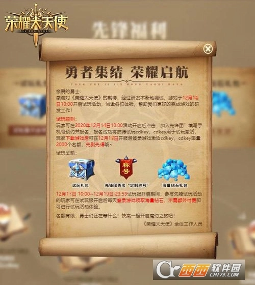 战歌嘹亮,见证荣耀与圣光。与首席先锋体验官—UZI进驻荣耀先锋试玩团,开启命运的冒险。《荣耀大天使》先锋试玩团正式面向诸位勇者发出征召。进入“先锋试玩活动专题”报名。报名成功的勇者将获得试玩秘钥cdkey(用于激活游戏)。届时,荣耀先锋服(试玩专属服)将在12月17日10:00时正式开启,持有试玩秘钥的勇者将抢先一步进入天使大陆体验游戏!