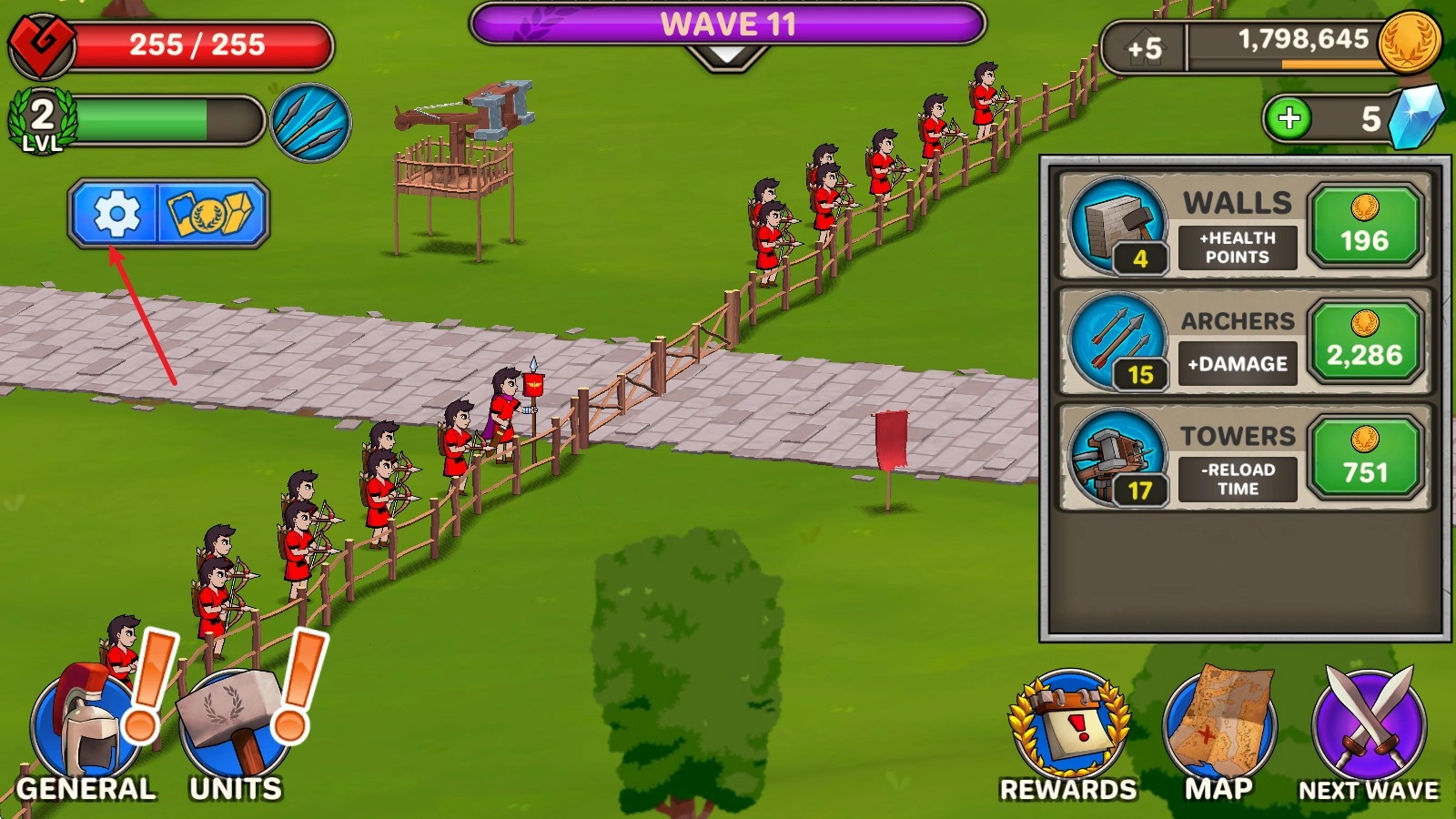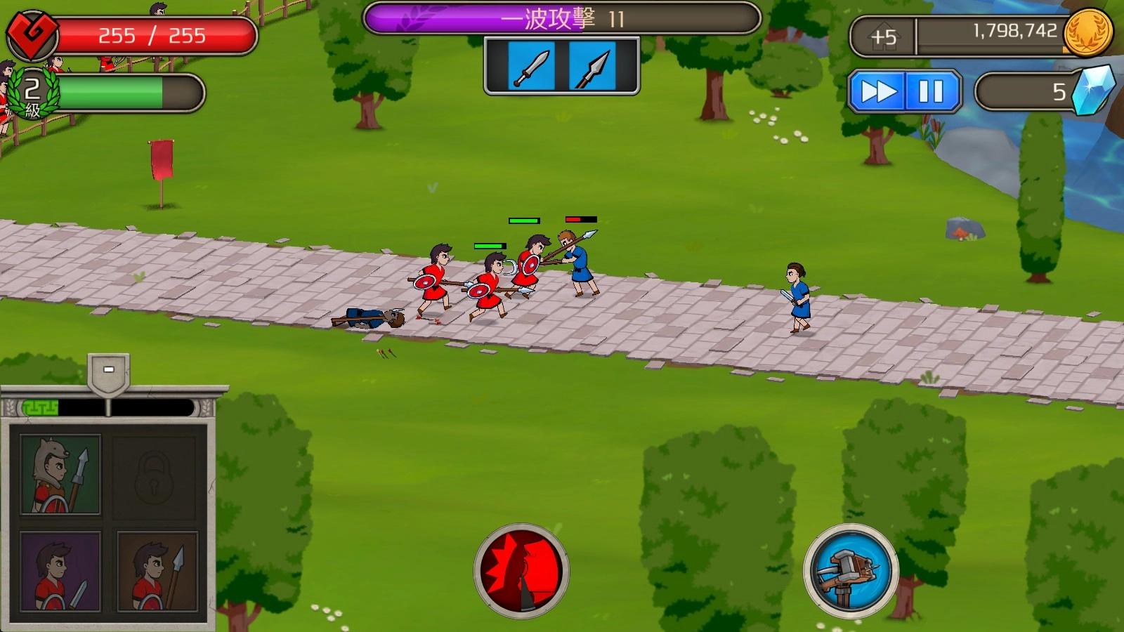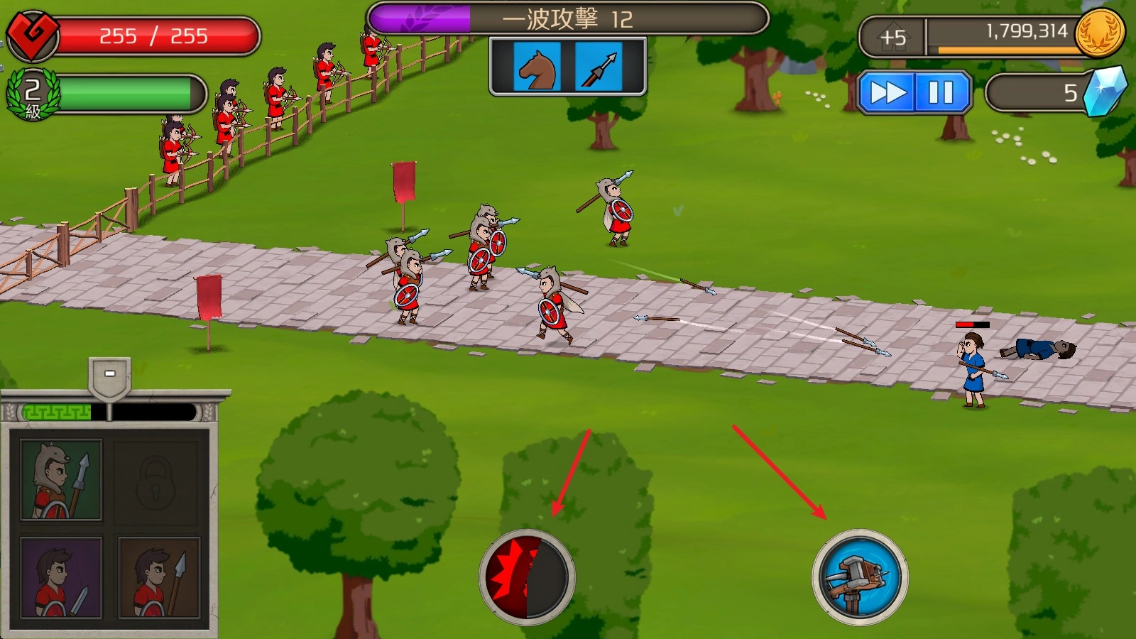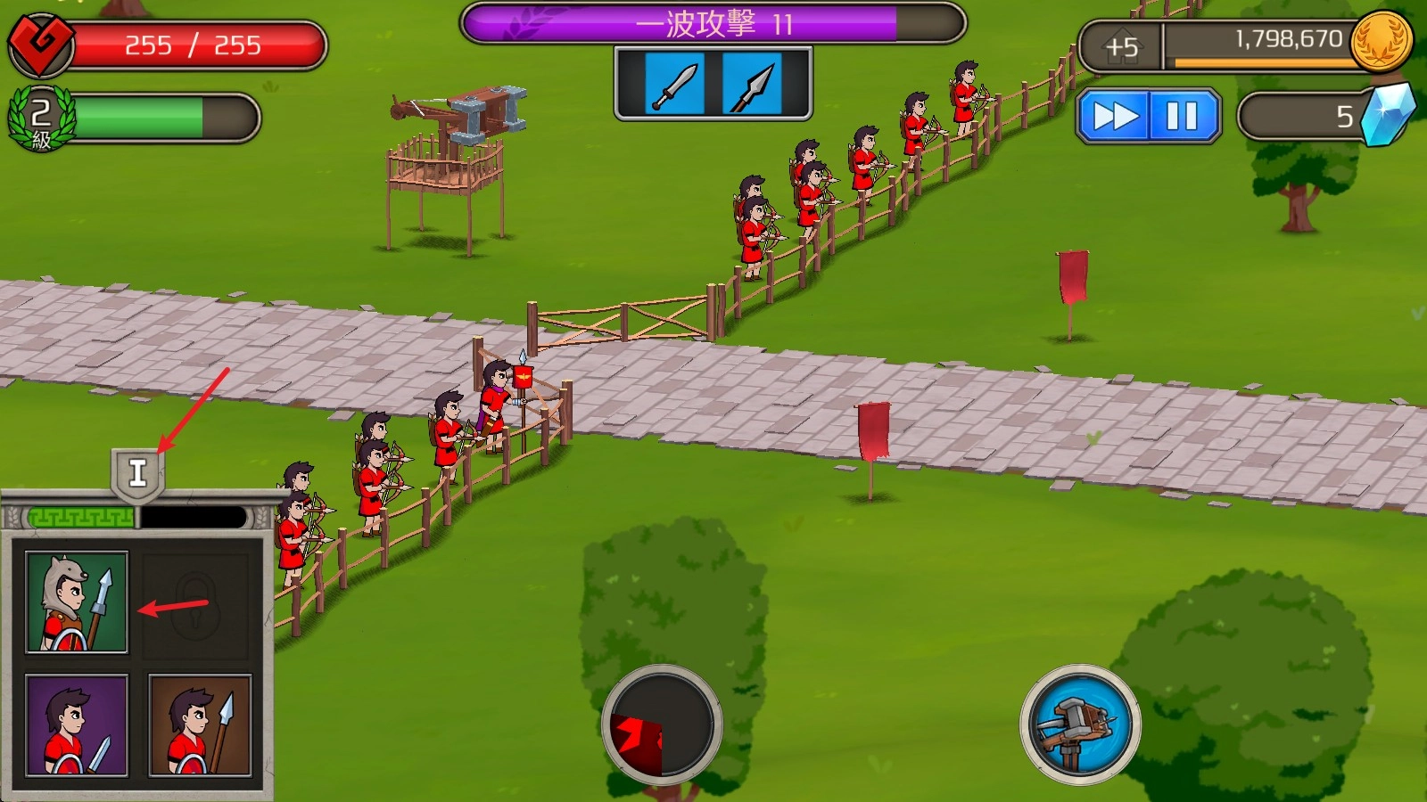 2、战斗开始后,点击左下角的士兵即可召唤,上方的数字代表可以召唤的次数。
