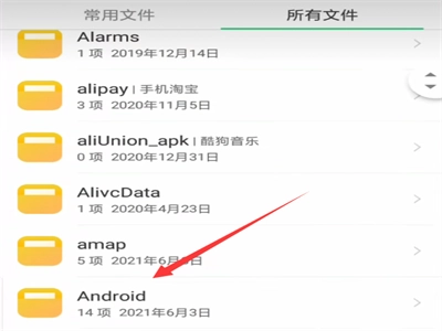 2、我们打开手机文件管理,然后将任意APK安装包放置到【android】。