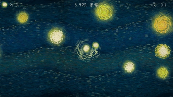《我们相距十万光年》是一款休闲独立游戏,玩家需要操控一个发光小球,在如梵高《星空》般梦幻的星海中穿梭。每次点击屏幕,小球便会从一颗星星飞向另一颗,累计飞行距离达到十万光年即可通关。游戏中,每飞过一万光年,屏幕就会浮现一句独白,例如“你是星星,洒满夜空”,搭配空灵的钢琴背景音乐,营造出一种孤独而富有诗意的氛围。