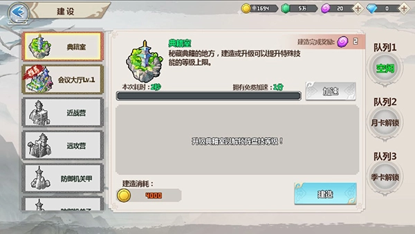 建议仙石花费100以下,直接加快建造速度,除非没有钱升下一个建筑了才慢慢等。