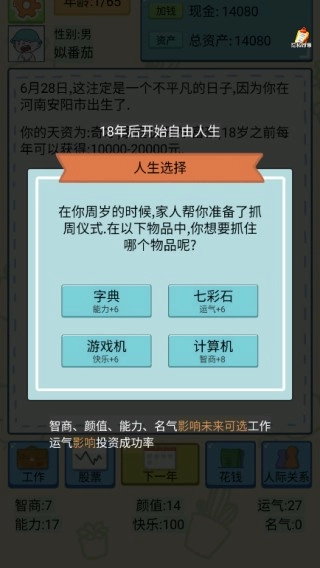 3.随后玩家需要进行人生选择,要注意,选择不同将会影响你的基础天赋属性哦,而天赋属性会影响后续事件的发展。