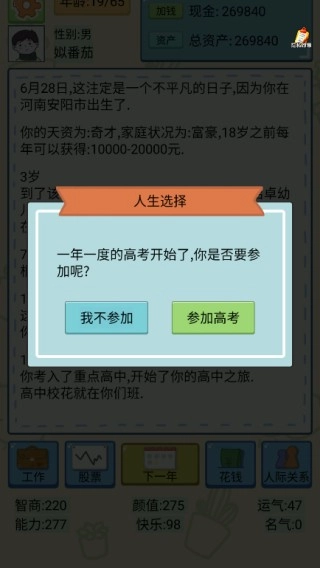 4.接下来玩家需要做出人生中的第一个重大选择——是否参加高考。根据选择的不同,你的人生轨迹也会发生变化!