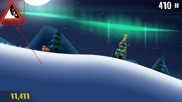 屏幕左上角的雪崩警示牌会在危险临近时闪烁提醒。即使已看到后方雪浪,只要及时起身加速滑行,仍有机会逃脱。