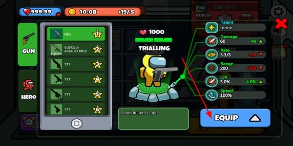 2、进入武器界面选择装备,通过对应操作升级武器属性,提升伤害等战斗能力,增强对局优势。