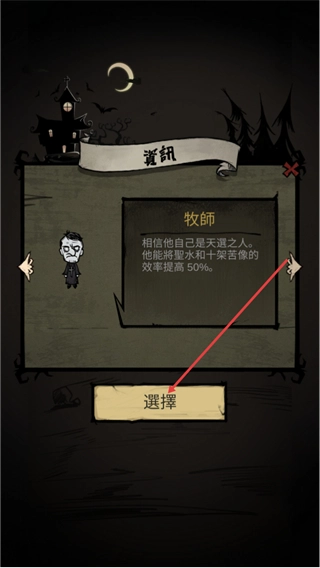 2、在角色资讯界面,查看牧师的技能提升圣水和十字架苦像效率后,点击底部的选择按钮,即可选定该角色。