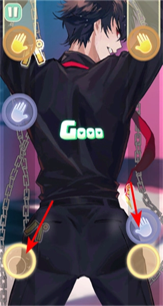 4、在节奏玩法环节,紧跟红色箭头指引,点击对应位置的互动按钮手掌图标,匹配节拍完成操作,推进进度。