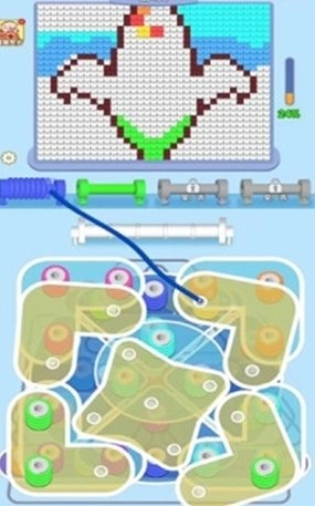 2、当柱子上缠满了对应颜色的毛线后就能自动填充到上方的拼图中,从而完成挑战。