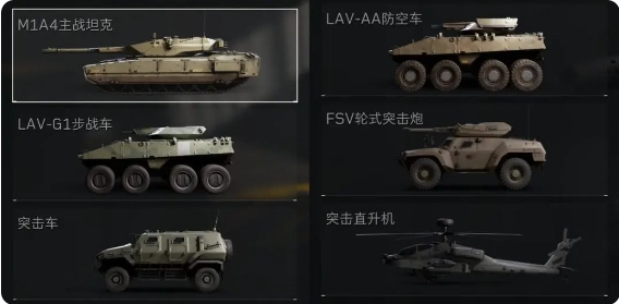 目前游戏中可进行个性化改装的作战载具有六种类型,包括M1A4主战坦克、LAV-G1步战车、突击车、LAV-AA防空车、FSV轮式突击炮以及突击直升机。
