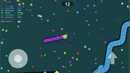 玩家在这里控制摇杆走位你的小蛇,吃掉地图上彩色的小圆点变长,小心!蛇头碰到其他贪食蛇对方就会死亡!