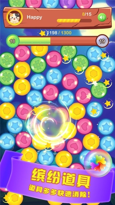4、看见五颜六色的泡泡一排排一列列的消除,你能获得到别具一格的快乐。