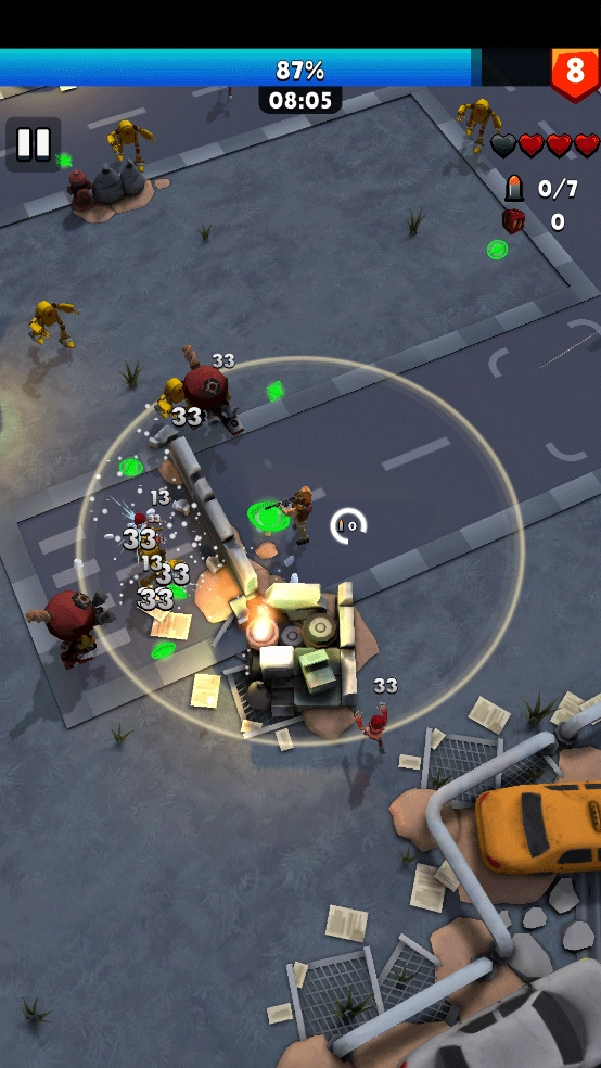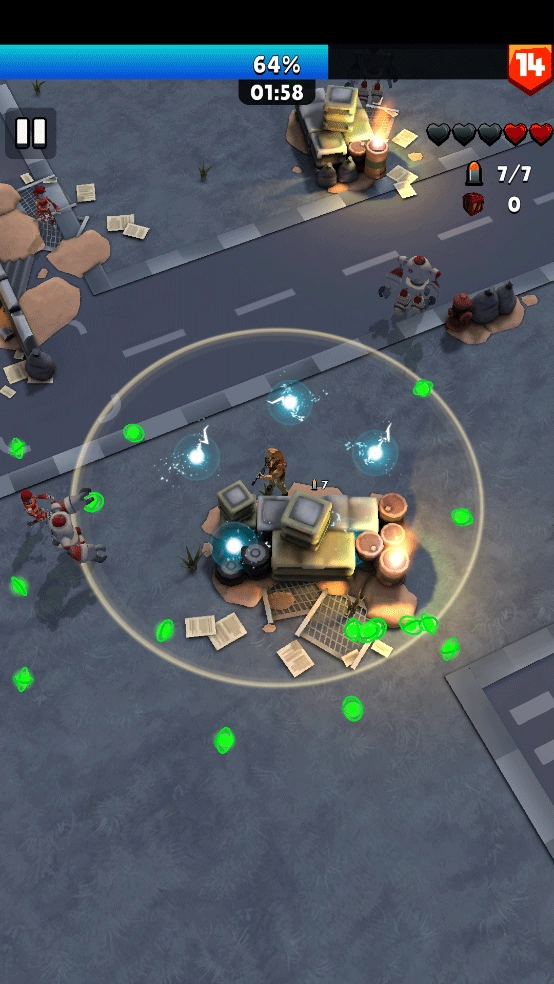 2、击杀机器人收集经验石,优先升级攻击范围与火力。