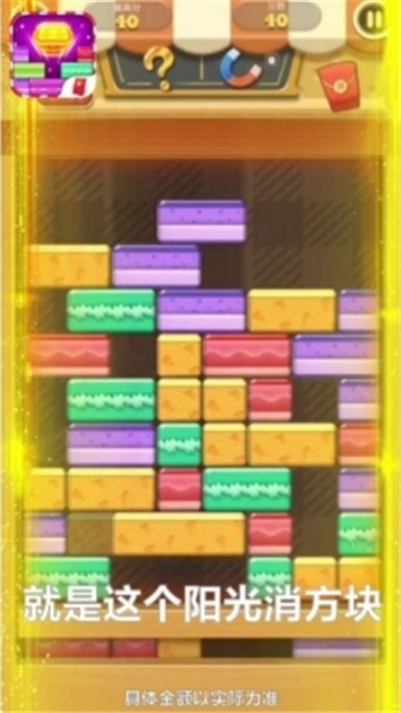 阳光消方块红包版是一款延续经典三消玩法的趣味消除赚钱小游戏,它的画风简洁清爽,游戏内提供了丰富多样的道具可供使用,玩家在游戏过程中还能收获不少红包奖励,是一款十分休闲减压的小游戏,感兴趣的朋友快来试试阳光消方块红包版吧!