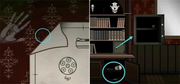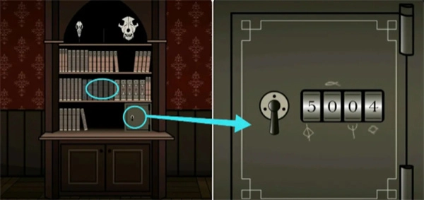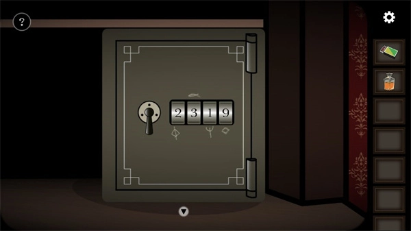 到书架那里先根据海报上的六个符号调整对应的书籍使其顺序一致,完成后可获得火柴,接着再根据下面保险箱上的符号提示获取密码2139,打开后拿走里面的钥匙和酒精灯。