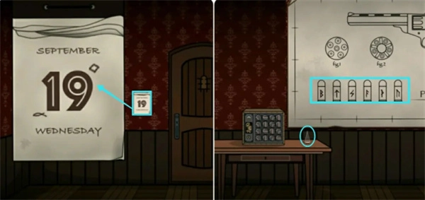 跟着线索来到嫌犯曾停留的702旅舍,门口日历上有我们需要的提示(符号与数字的对应关系:∝对应1,◇对应9),先把这些记下来,接着去左边取走桌上的长颈瓶,再留意海报上的六个符号。