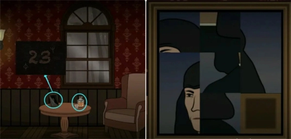 来到窗边拿走茶几上的玻璃杯和威士忌酒瓶,然后点击旁边的相框完成上面的拼图,接着再观察人物嘴中的提示(符号对应的数字:2 Ψ3)。