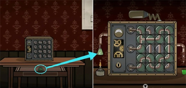 用钥匙打开机器下面的抽屉拿到药丸,然后将收集到的道具全部摆放或安装在机器上,接着完成管道连接,再用火柴点燃酒精灯,最后拨动开关打开右边的阀门获得装有奇怪液体的玻璃杯。