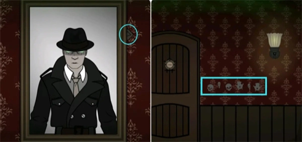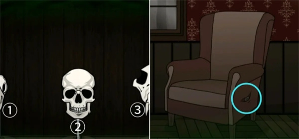 将骷髅头摆放在柜子的最上层,然后根据门口的提示(骷髅头点击顺序)按②①②;③①③的顺序点击骷髅头获得眼球,接着到右边用匕首划开沙发获得第三块符号方块。