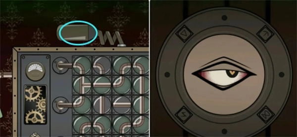 用螺丝刀卸下机器顶部的玻璃罩拿到最后一个符文方块,接着来到门口点击门上的猫眼,先将符文方块和眼球放上去,再根据眼睛所看方向依次点击符文方块,完成后获得新提示。