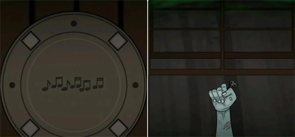 根据提示按①②①;③②③的顺序点击柜子上的骷髅头获得断指,接着打开窗户将其交给外面的尸体的手中换取钥匙,最后用钥匙打开旅社大门完成第一章。