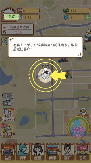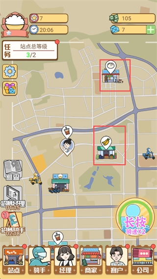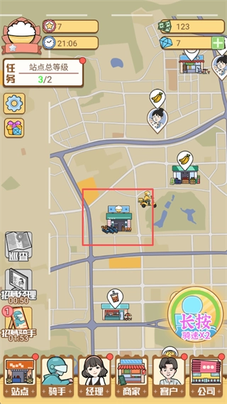 1、站点拓展:解锁城市内各个区域的版图,搭建站点,让外卖站点覆盖全市各个角落。