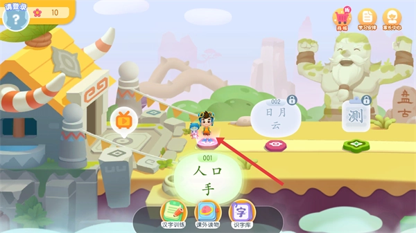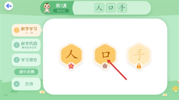 1、在主界面找到并点击【人口手】课程模块,即可进入该课程对应的汉字学习页面。