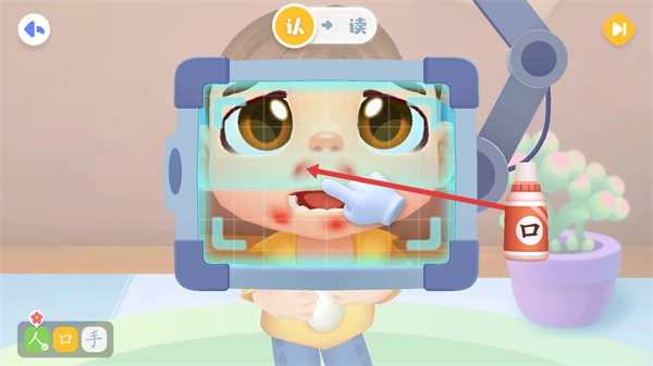 3、跟随指引识别与“口”相关的部位(如嘴巴),完成汉字与对应身体部位的关联认知。