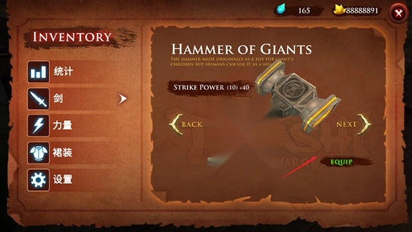 4、点击右上角的暂停菜单后,就可以看到剑、力量、裙装的配饰详细介绍,点击EQUIP你可以换上新的武器与裙装。