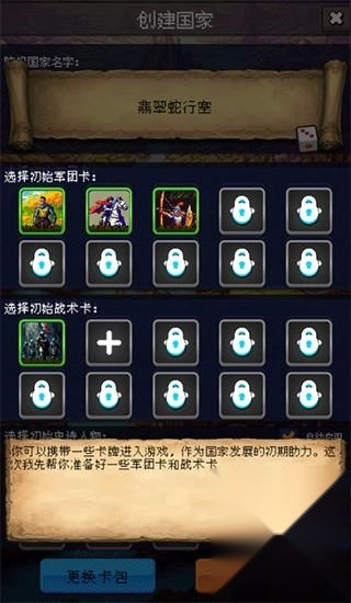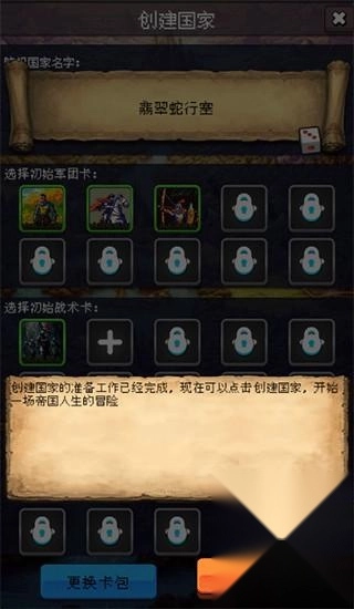 1、玩家在创建自己的国家时,能够携带部分卡牌作为初期助力进入游戏