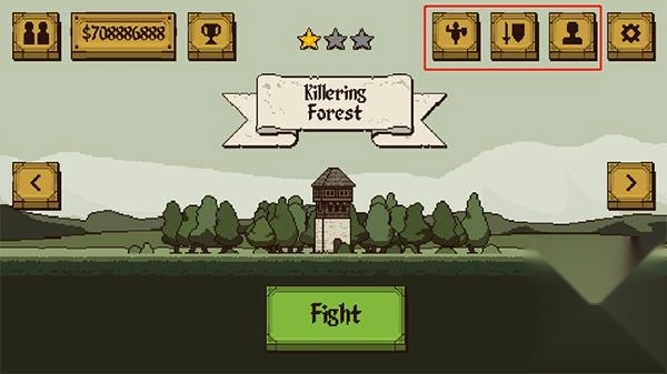 2、点击中间“Fight”即可开始游戏,上方从左到右依次为训练场、武器、人物;