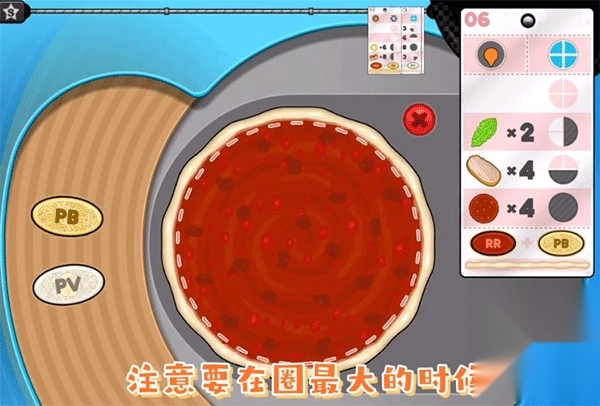 2、注意要在虚线圈范围最大的时候再点击酱料,这样会全铺在披萨饼上。