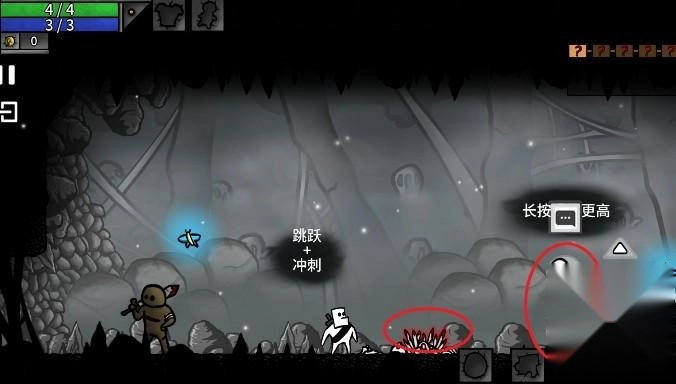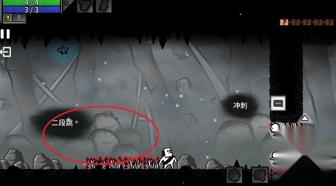 第三个钉刺需要完成二段跳,才能过关哦,还是跳跃加冲刺一起长按